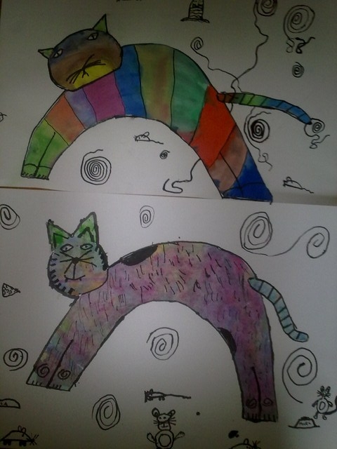 Na tvrdý papír A4 si načrtneme tužkou oblouk(tělo kočky), hlavu, uši a ocásek. Na tento papír zapíjíme vodové barvy a necháme zaschnout, pak vystřihneme a nelepíme na tvrdý papír A3. Obrysy a detaily namalujeme tuší.