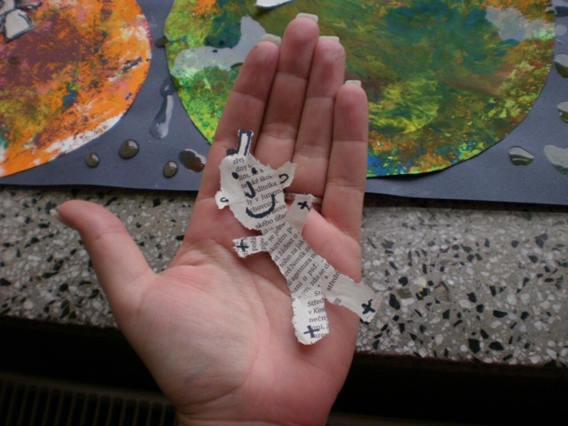 Na ruku si žáci navlečou mikrotenový sáček, který natřou temperovou barvou a tisknou několikrát na papír přes sebe různé barvy. Z papíru pak vstřihneme kruhy - planety, které nalepíme na černý papír - vesmír. Z novin vytrháme postavičky ufonů, detaily ufonů mohou žáci dotvořit černým fixem.